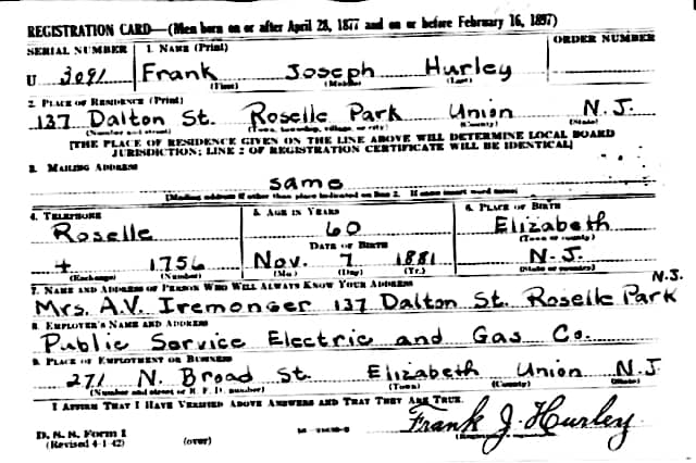 During this time period there was also a blue-collar worker named Frank J. Hurley who lived in Elizabeth.