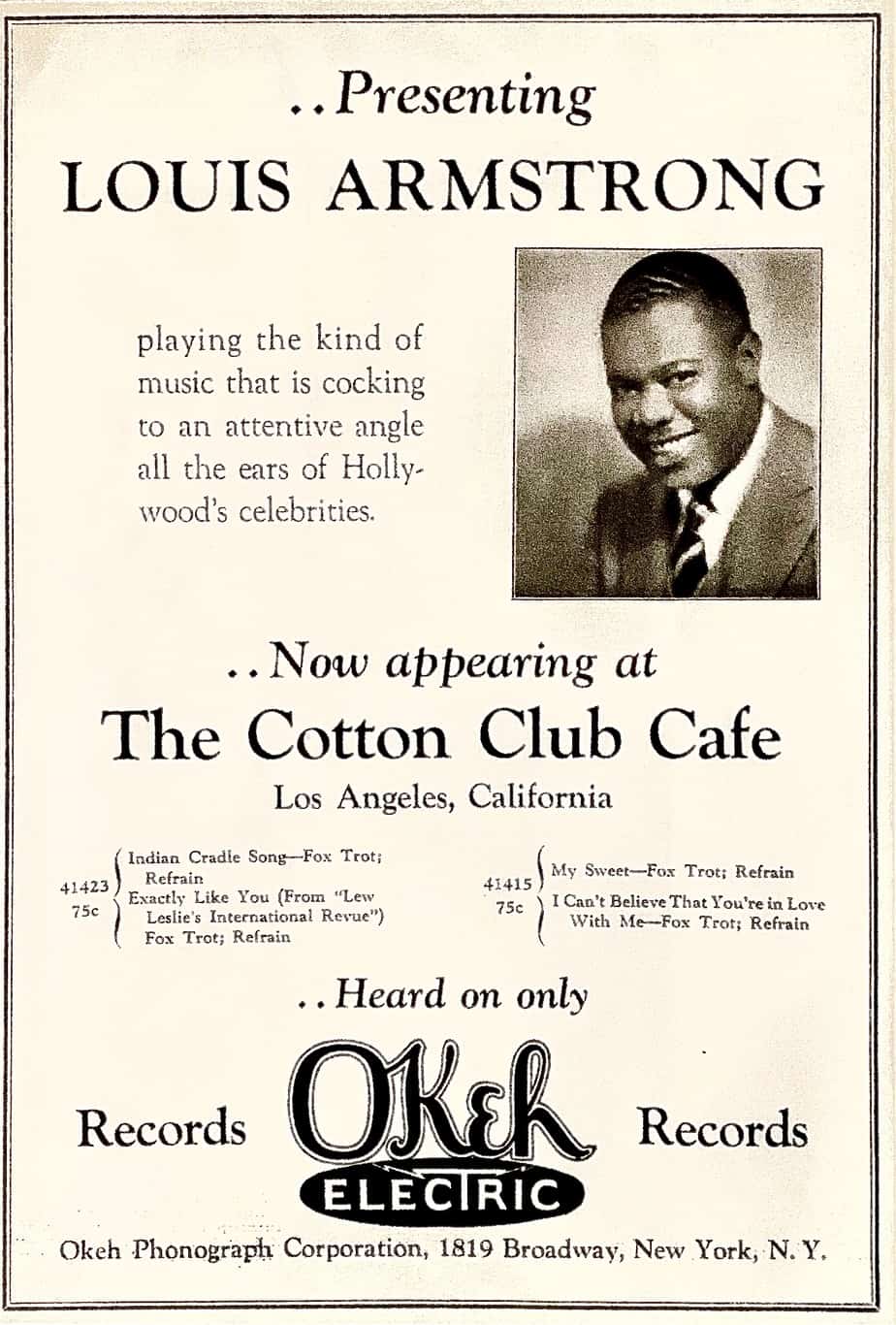 Okeh advertisement from 1930 for Louis Armstrong’s visit to Los Angeles.