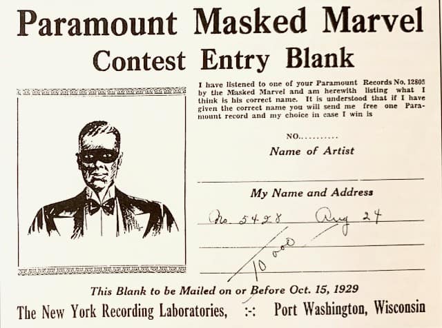 What was to be Patton’s third issued 78 was put out under the name “The Masked Marvel”. Through flyers and newspaper advertisements in the Black press buyers were asked to guess the name of the artist to win a prize. “Who is the Masked Marvel?” Economic times had changed. For the Ma Rainey “Mystery Record” a winner could take home a phonograph player or a large stack of Paramount 78s. But by 1929 with the Patton 78, the record company was already starting to feel hard times coming, and the winning prizes reflected that: only one record per winner.