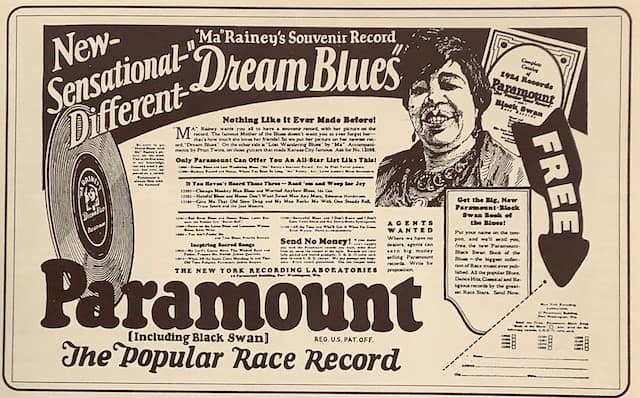 In 1924, as a way of commemorating Ma Rainey’s new prominence, and to highlight Paramount’s newfound success, the company issued its first portrait label using an etched likeness from a photograph of the “Mother of the Blues”. “‘Ma’ Rainey wants you to have a souvenir record, with her picture on the record,” read the Paramount advertisement.