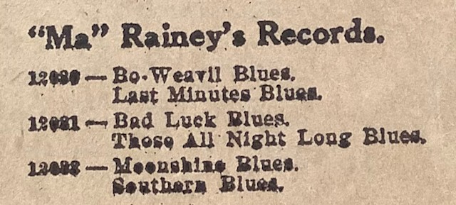 The following ephemera is from the Bowman collection: Ma Rainey record and sleeve; orange Masked Marvel advertisement (reproduction from John Fahey’s Screaming’ and Hollerin’ the Blues: The World of Charley Patton, CD box set); Ma Rainey advertisement headshot, and two Ma Rainey record listings.