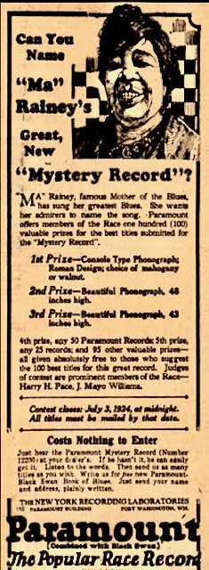 That Paramount would use specially-designed 78 labels was not unique for itself or the recording industry in general. Paramount was constantly searching for new ways to generate publicity in order to increase record sales. In fact, in 1924, the same year it put out the “Ma” Rainey portrait label, Paramount also promoted its new recording star through her “Mystery Record”, inviting fans to win prizes by submitting names for its two untitled songs.