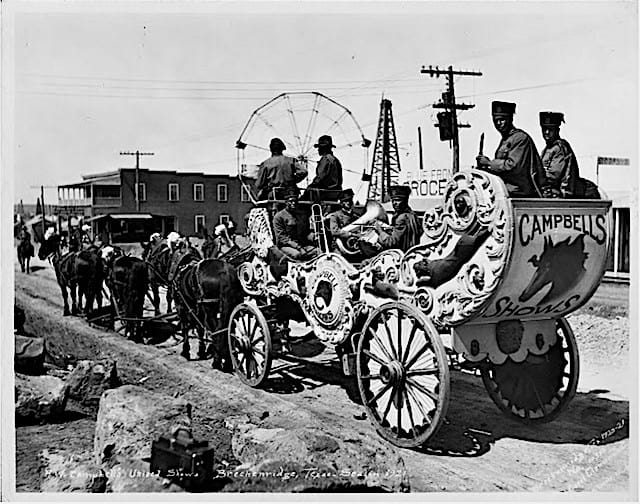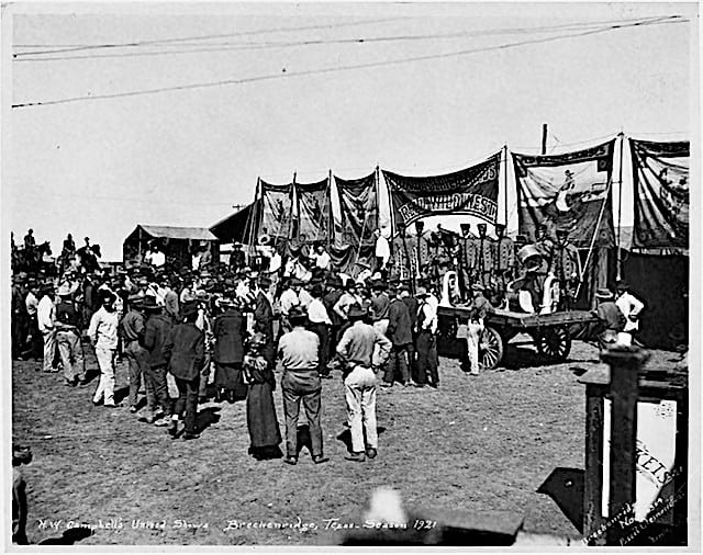 H.W. Campbell’s United Shows opened its Texas tour in February featuring a “Wild West Show” theme, featuring cowboy acts, a Black band wearing calvary uniforms, White musicians, bucking broncos, and bear acts. It stressed “no girl shows” and “no graft”.
