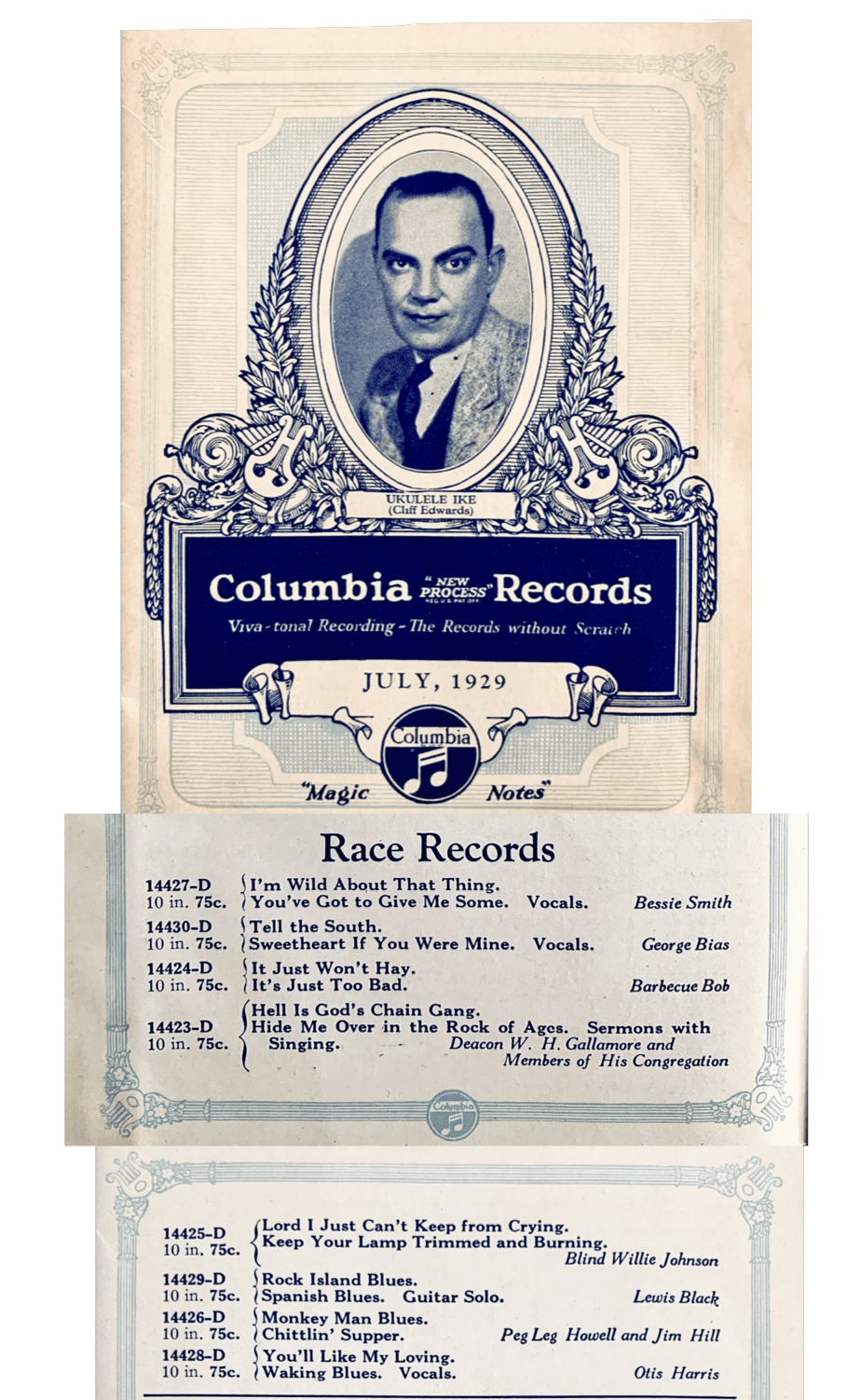 However, the Blue Bird Catalog has photos of its musicians segregated by race. Pages with photos of Black artists are shown.